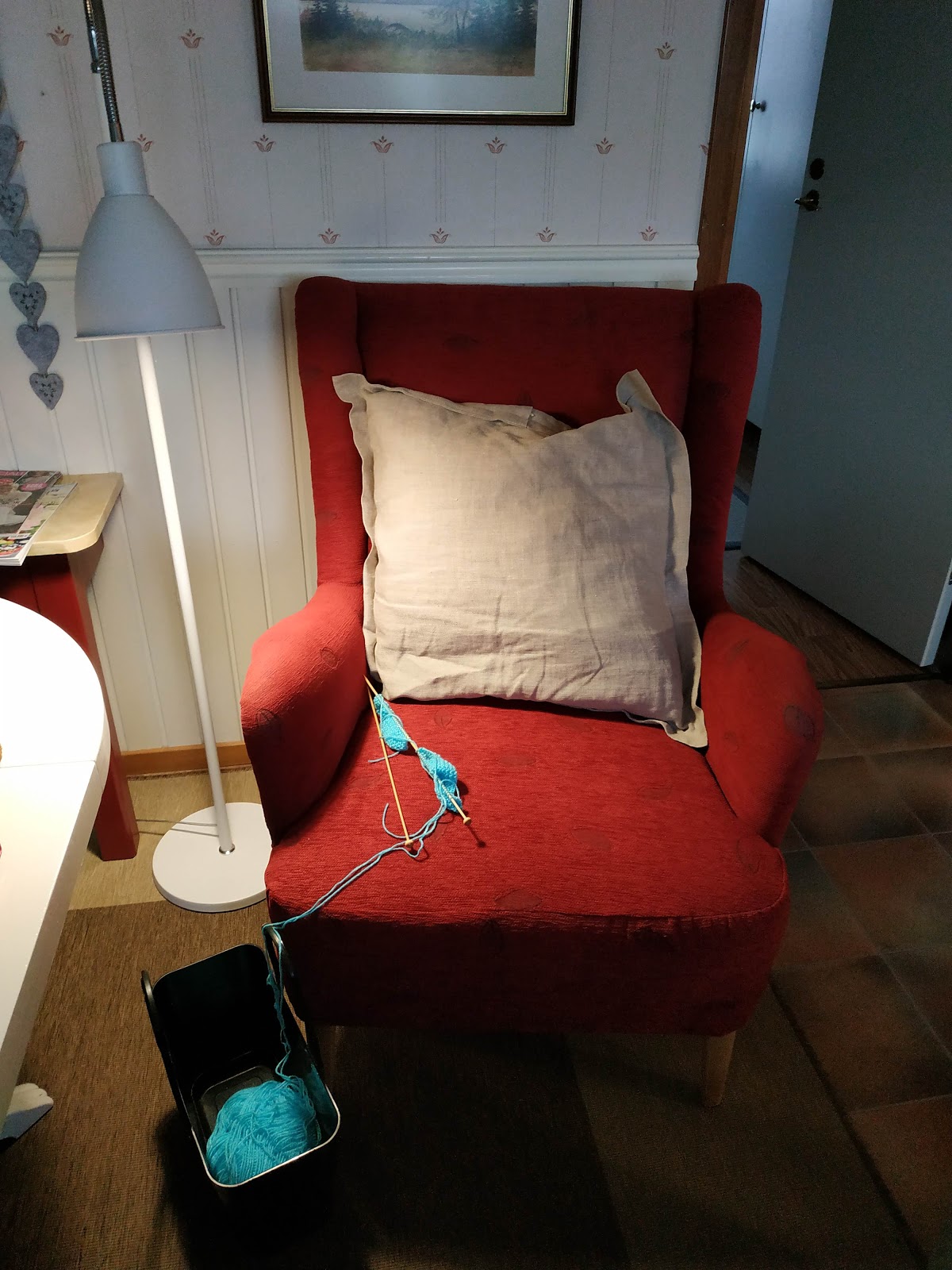 Så här blev vår fåtölj när vi gjort om sitsen, den är omklädd för ganska många år sen men så lossnade en fjäder inuti botten och då bytte vi ut allt mot skumgummidynor och satte nytt tyg på. Förut var sitsen sned och obekväm men nu har vi en skön fåtölj att sitta och sticka i.